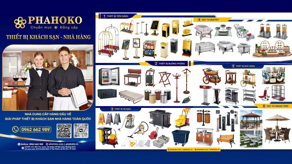 Bên cạnh thùng rác sảnh, Phahoko còn cung cấp trọn gói: Xe đẩy dọn phòng, thiết bị buffet, đồ dùng buồng phòng… giúp đồng bộ hóa toàn bộ nhận diện thương hiệu cho cơ sở của bạn.